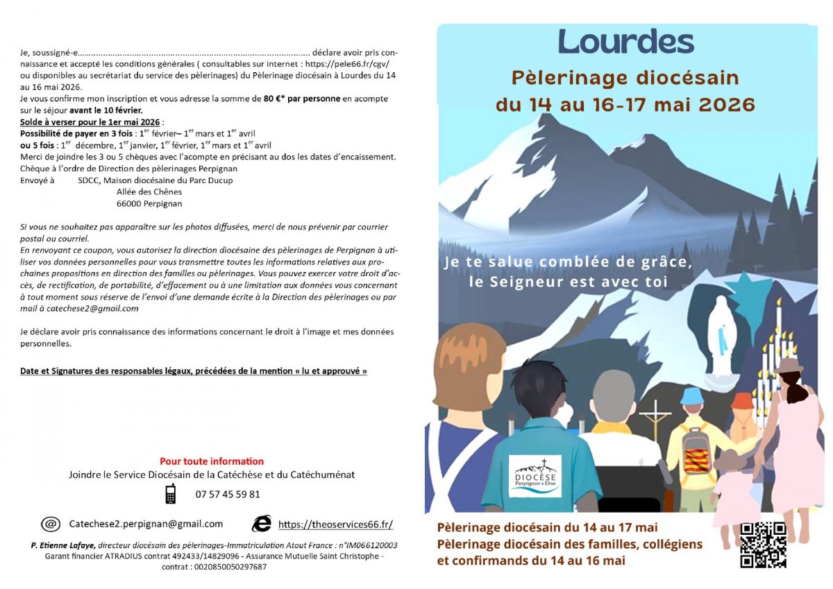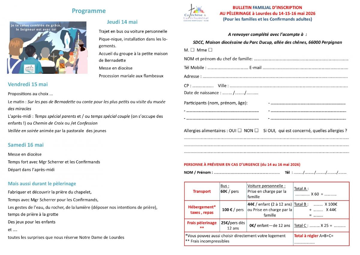 Du 14 au 16 mai prochain, embarquement pour Lourdes en famille, le diocèse vous accompagne pendant trois jours pour vivre un temps privilégié avec Nd de Lourdes. Temps en famille, temps pour les couples, temps pour les parents, veillées, temps d’enseignement. Il y en a pour tous. Laissez-vous porter pendant ces trois jours! Le dossier à compléter est ici